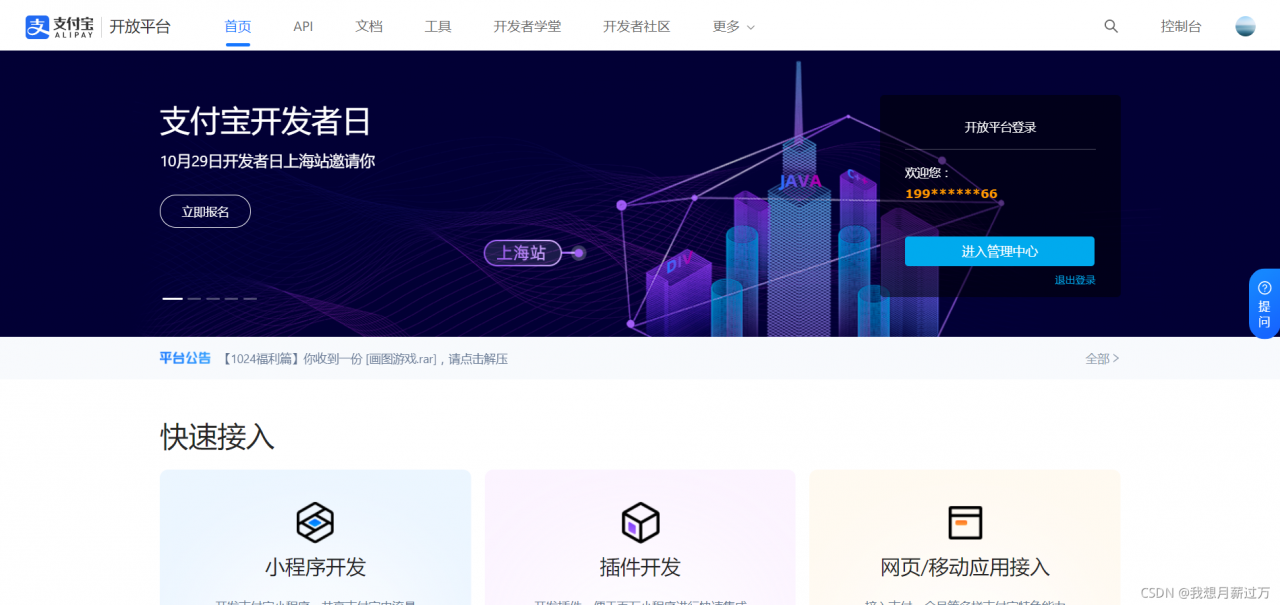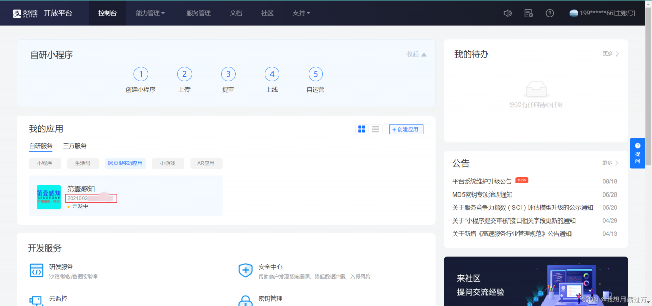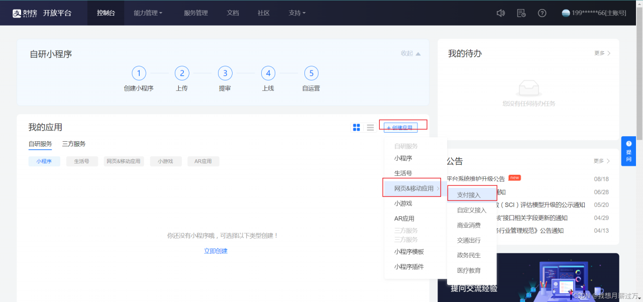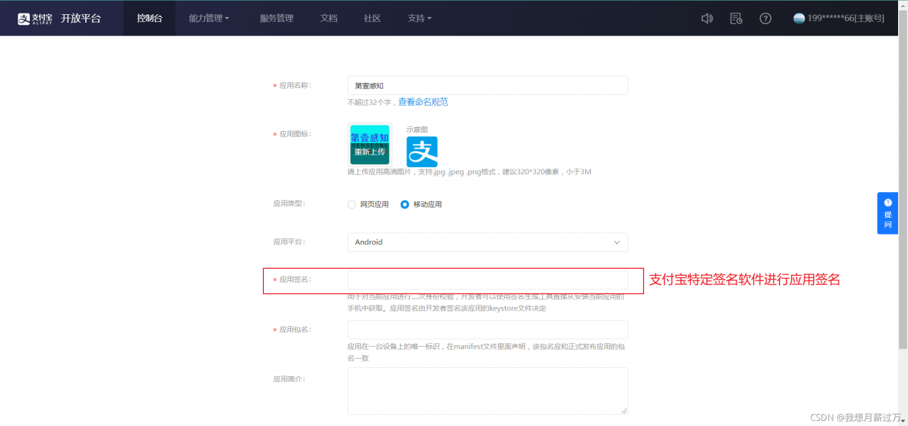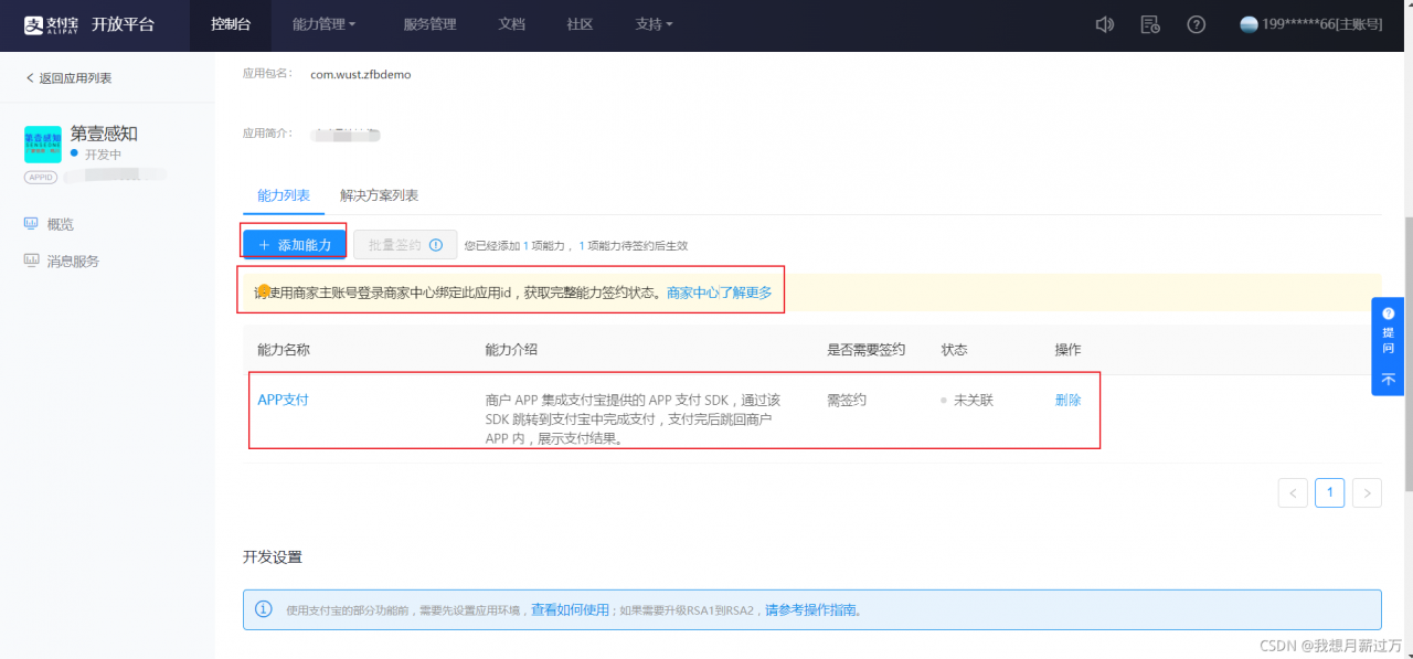 可以看到,我在这里选择 App支付,他对这个能力有一个要求:请使用商家主账号登录商家中心绑定此应用id,获取完整能力签约状态,绑定网址已经为大家找好了