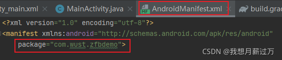 (1)应用包名的获取:在自己的安卓项目中的AndroidManifest.xml文件内找到package对应的值,具体如下图所示。