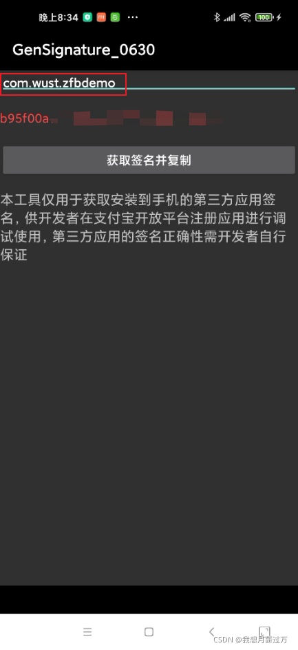 (3)安装应用签名获取工具至手机端,打开安装好的GenSignature,输入(1)中获取的应用包名,点击获取并复制即可拿到签名,具体如下图。