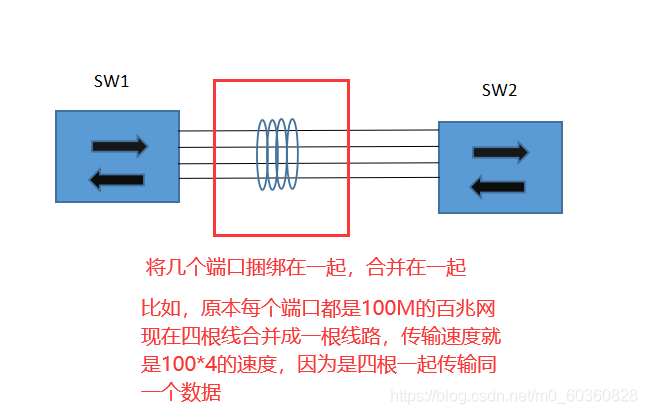我这粗糙的画了个草图,如果原本没有做线路的聚合,则是用一个端口传输一个数据,假如这个数据是500M的,端口是百兆网,用这个端口则是需要传输5秒。如果用聚合四根的聚合线路,每秒传输100M*4的传输速度,比原本快很多。
