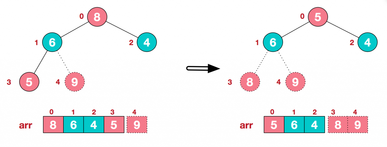 //重复步骤二三,即最大元素调整到最后,然后剩下的部分继续构造大顶堆,算法复杂度 n*log(n)
