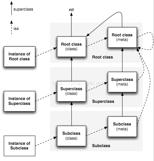 注意:所有的metaclass中isa指针都是指向根metaclass,而根metaclass则指向自身。根metaclass是通过继承根类产生的,与根class结构体成员一致,不同的是根metaclass的isa指针指向自身。