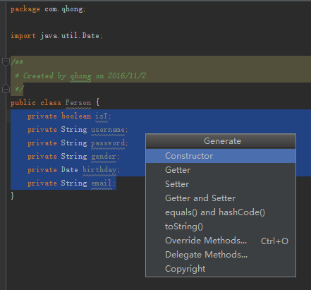 idea有很多快捷方式(Alt+Insert),比如get,set,构造函数,hashcode,equlas....