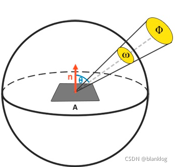 另外,光源往往以点光源的形式存在像烛光,灯泡,离我们很遥远的恒星, 它们朝着四面八方发光向外扩散。我们以发光点为圆心作半径为1的一个球,球的面积为,在球的表面取面积为1的一块圆片,这块圆片对应一个锥形空间称为1立体角(sr),它可以帮我们描述光在不同方向上的强度。