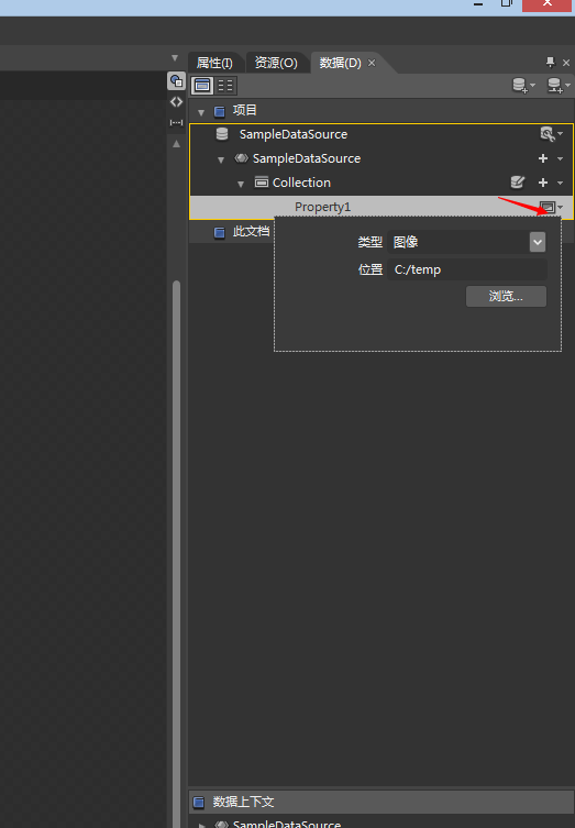 然后再新创建的示例数据中(默认会有两个Property,我们删除一个,只保留一个),将那个图中所示的修改成图像的属性,那个位置选你的图片所在位置,不选也可以(会生成默认的图片),然后就是将Collection直接拖动到ListBox控件中。
