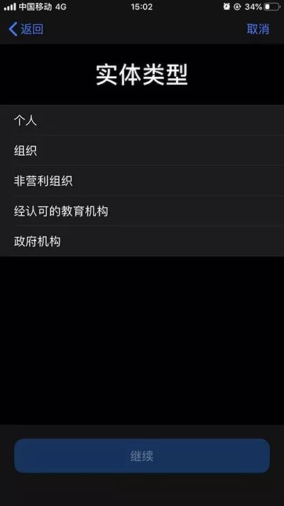 如果是以组织身份来注册,选择账号类型后,还需要根据界面的提示完善信息,包括实体类型、法人实体名称、D‑U‑N‑S 编号、总部地址和电话号码、网站、签字权确认等。注册信息一经验证和批准,您会收到一封电子邮件,告知您可以在 Apple Developer app 完成注册。