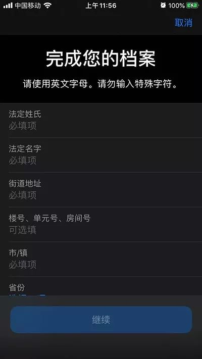 5.完善个人地址信息,需要注意这个页面要用英文字母填写信息,不然会报错。完成后轻点“继续”。