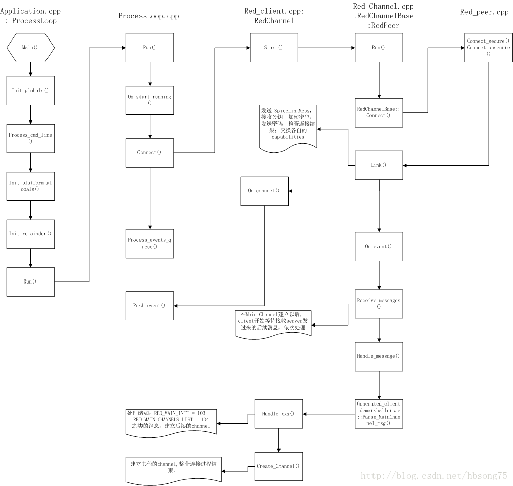 | Receive_messages() | 在Main Channel建立以后,client开始等待接收server发过来的后续消息,依次处理,调用handle_message() |