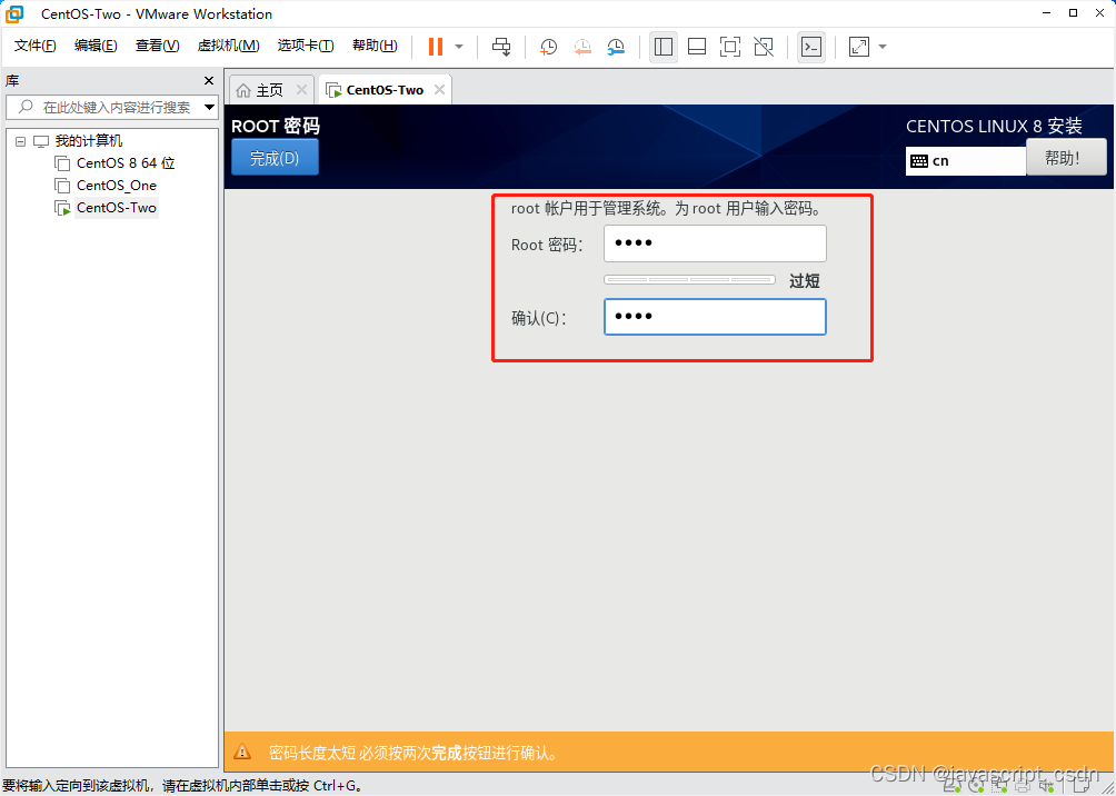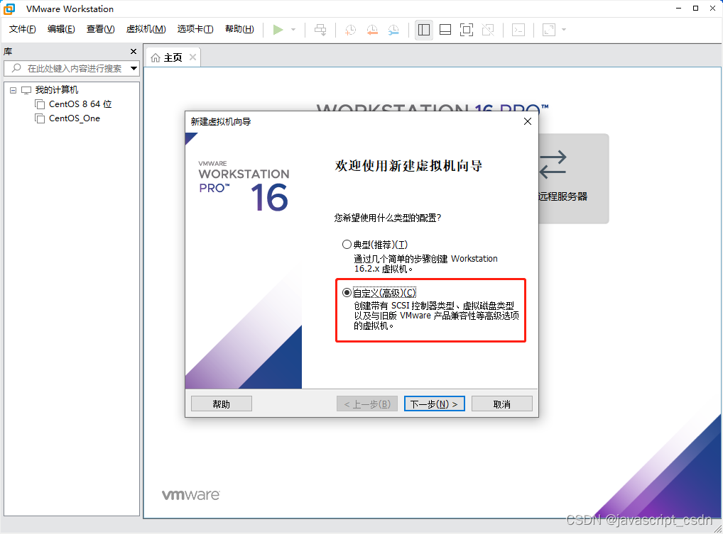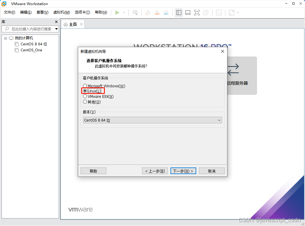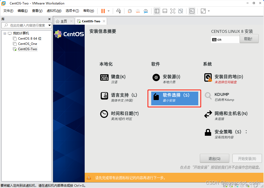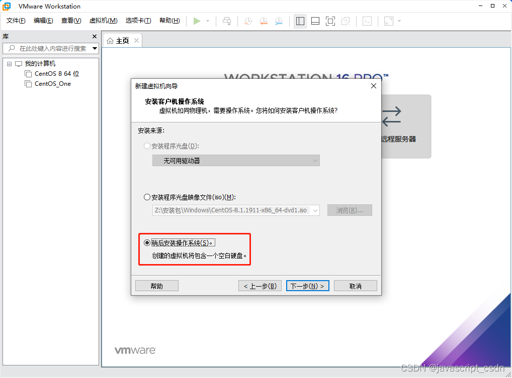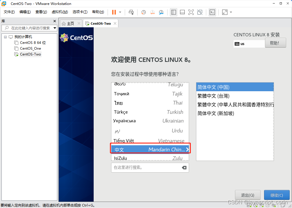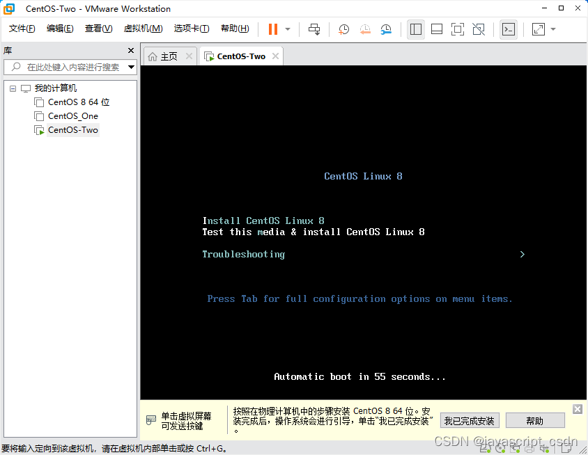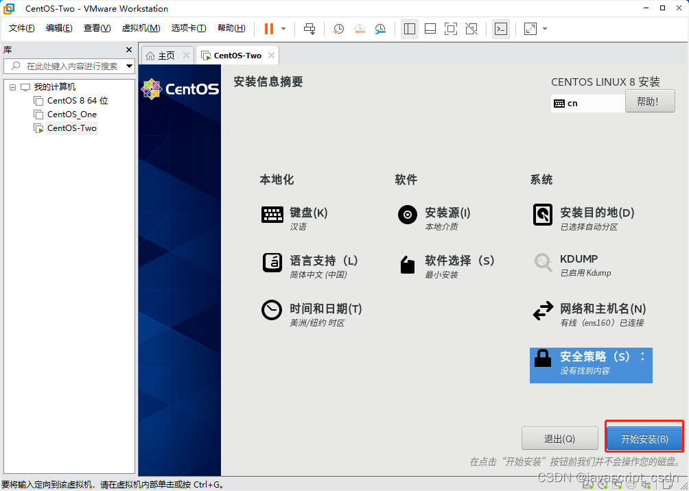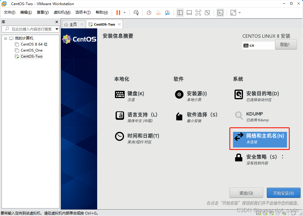 VMware虚拟机安装 CentOS 8 版权声明:本文为javascript_CSDN原创文章,遵循CC 4.0 BY-SA版权协议,转载请附上原文出处链接和本声明。原文链接:https://blog.csdn.net/javascript_CSDN/article/details/125166573