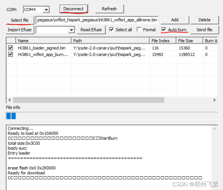 同时勾选“Auto burn”,点击“connect”,复位润和 Wifi-IOT 开发板的复位键,烧录开始。
