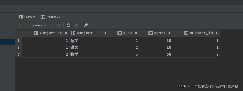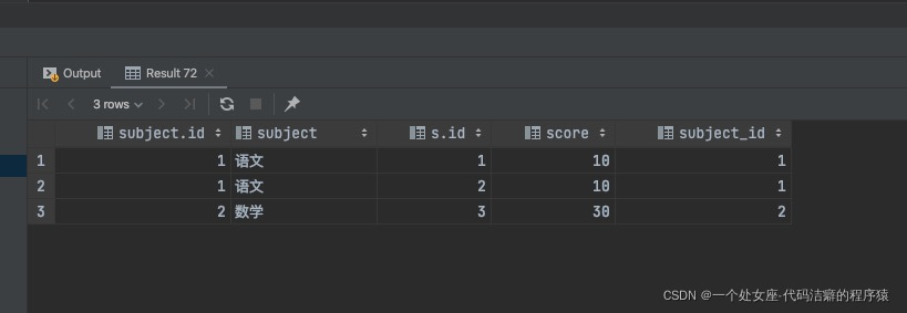 select subject.*,s.* from subject inner join score s on subject.id = s.subject_id;执行结果: