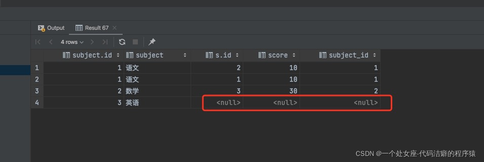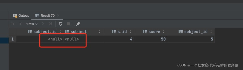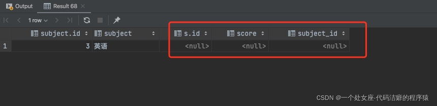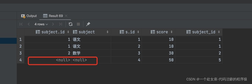 select subject.*,s.* from subject right outer join score s on subject.id = s.subject_id;执行结果 :