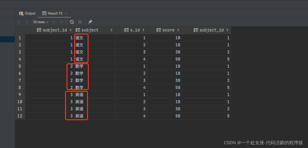select subject.*,s.* from subject join score s on subject.id = s.subject_id;执行结果: