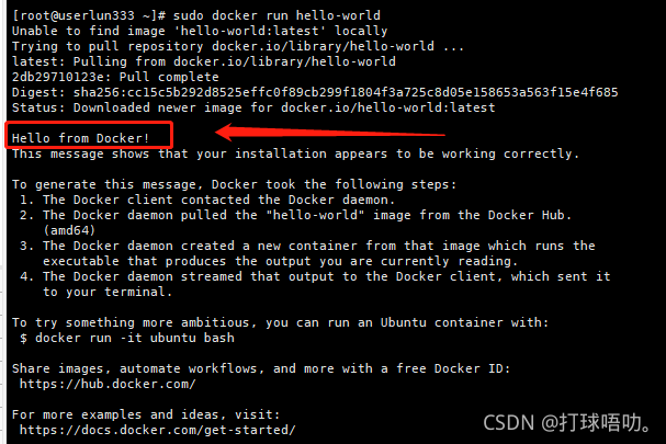 sudo docker run hello-world以下为校验安装成功的结果图示: