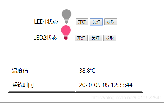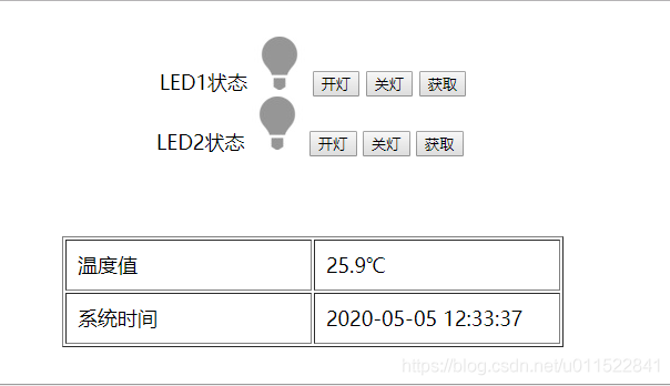 然后就得到显示界面了。温度值和时间都是1S变化一次,LED的状态每次进入都默认为关,如果想知道当前的LED状态,则可以点击获取。有点像智能家居的感觉了