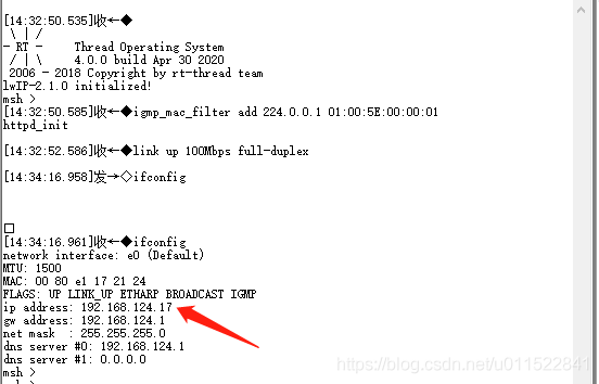 然后我们通过串口输入ifconfig来查询一下开发板的IP: