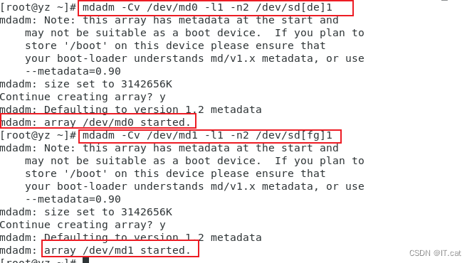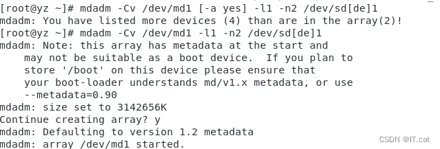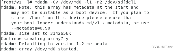 mdadm -Cv /dev/md0 -l1 -n2 /dev/sd[de]1 ##创建RADI 0