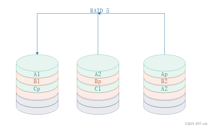 RAID 5 必须由N(N>=3)块盘组成阵列,一份数据产生N-1个条带,同时还有一份校验数据,共N份数据在N盘上循环均衡存储
