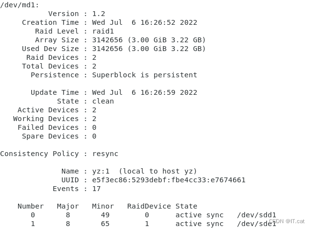 mdadm -D /dev/md1 ##查看磁盘详细信息