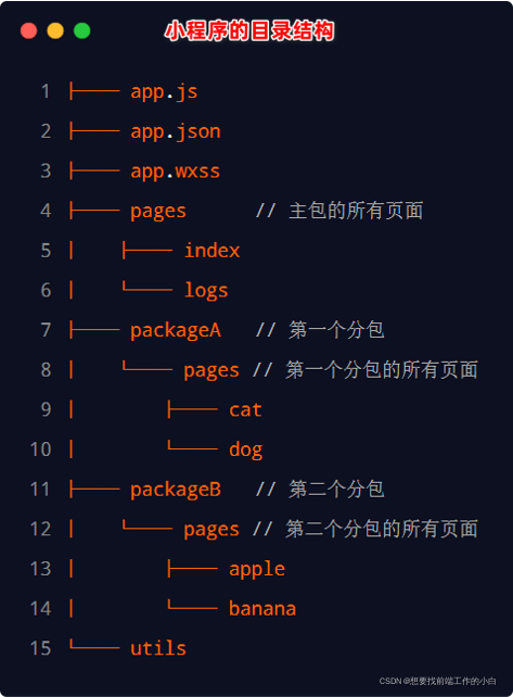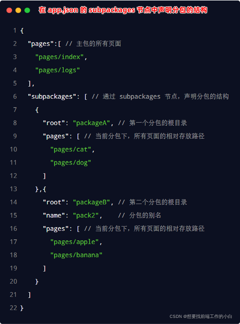 1.定义:分包指的是把一个完整的小程序项目,按照需求划分为不同的子包,在构建时打包成不同的分包,用户在使用时按需进行加载。