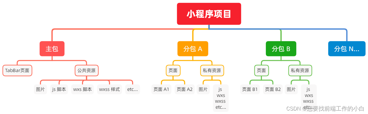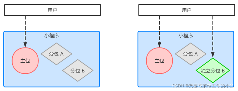 分包后:小程序项目由 1个主包+多个分包组成: