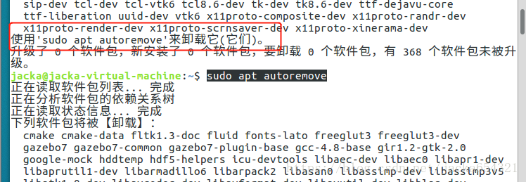 上述命令只是删除ros-indigo-desktop-full而已,并没有删除gazebo7和默认的依赖库。需要执行以下操作,删除所有与gazebo有关的东西,否则在后续安装中会提示依赖项问题。