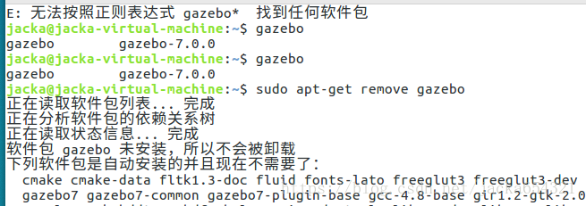 sudo apt autoremove可以在终端输入gazebo并按table建,发现没有任何输出,说明已经完全删除了与gazebo有关的内容。