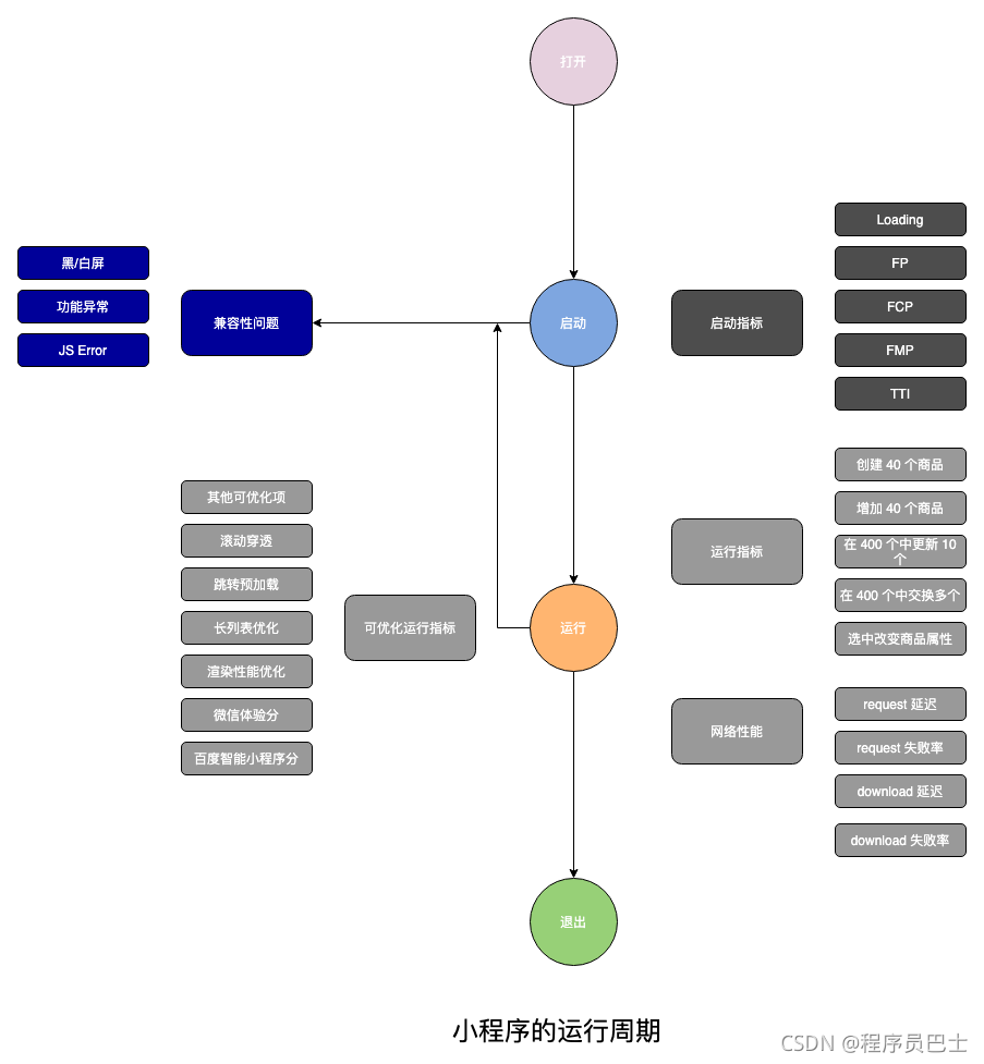 通过上图可以很清晰的看出整个小程序运行生命周期需要考虑那些指标,这就是画图的力量。