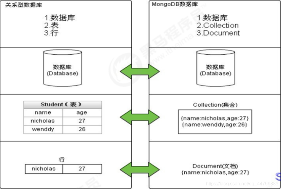 MongoDB的最小存储单位就是文档(document)对象。文档(document)对象对应于关系型数据库的行。数据在MongoDB中以 BSON(Binary-JSON)文档的格式存储在磁盘上。