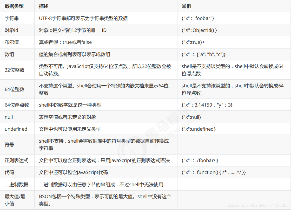 BSON数据类型参考列表: