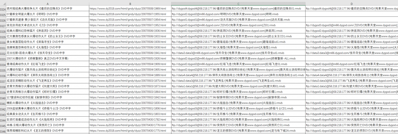运行了两个小时左右吧,终于爬完了 113 页,共 3346 部动作片电影的数据(本来不止这些的,但是有一些电影没有提供下载链接,我在 excel 中排序后直接手动剔除了)。