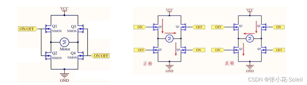 通过4个晶体管的H桥连接,改变A、B控制端高低电平的方向,实现驱动电流方向改变,并改变电机的转动方向,如图所示: