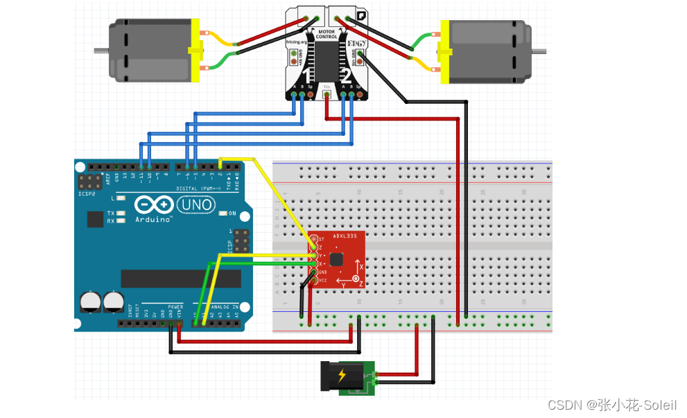 L298N驱动模块的供电电源。在独立供电电源接12V供电输入端输入7-12V电源电压时,短接跳线冒处于短接状态,可以通过5V接口接入Arduino开发板的“Vin+GND”端口反向Arduino供5V电。当独立供电电源是12-24V时候,必须拔下短接跳线帽,此时独立供电电源对驱动板逻辑电路电机供电,不对外供电输出。