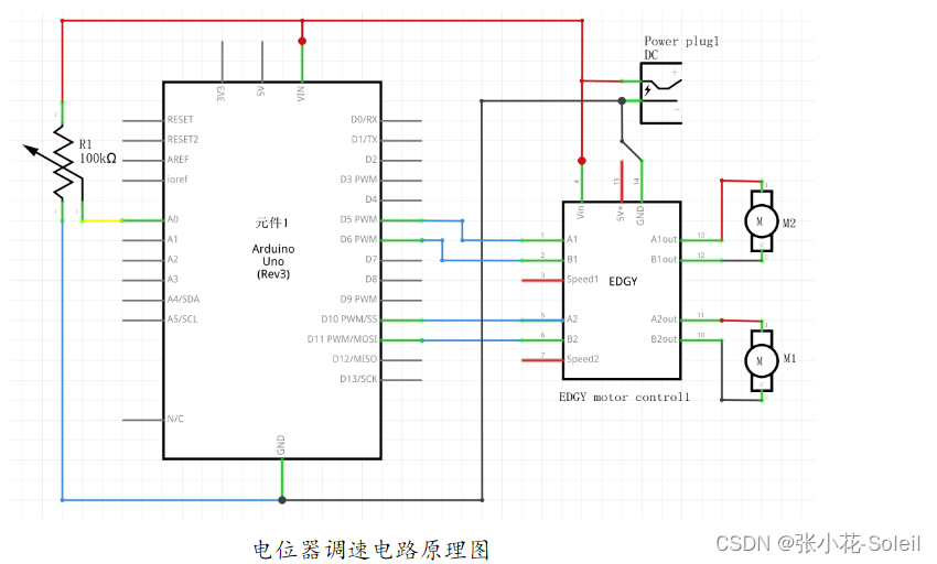 先只单接直流电机A驱动电路,IN1、IN2输入接D5、D6接口,电位器滑动头引脚接A0接口。