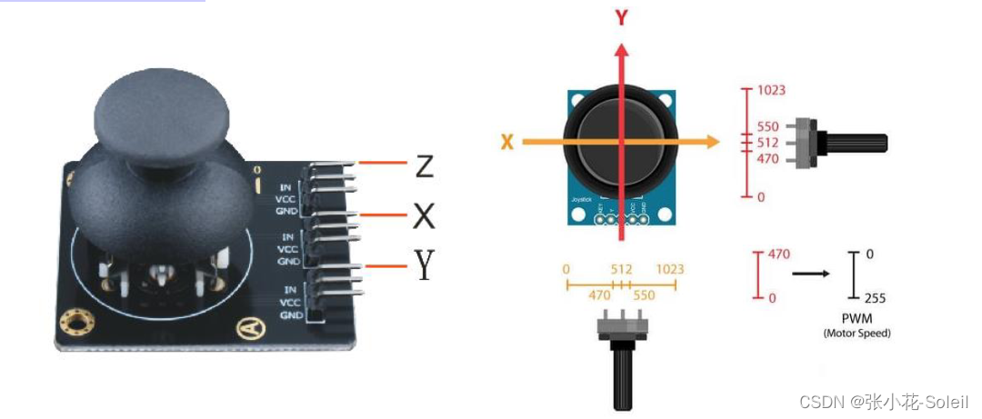 摇杆实际上是由两个电位器连接到Arduino的模拟输入,它们的值从0到1023。操纵杆保持在垂直状态的中心位置时,电位器X/Y轴的值在512左右。如果以512左右的值为中心,摇动操纵杆X轴,数值低于512时可使电机向一个方向旋转,当数值高于512时可控制电机旋转方向反向;将X轴的读取值0-511映射换为255-0,X轴的读取值512-1023映射为0-255,通过转换为PWM值控制电机的速度。
