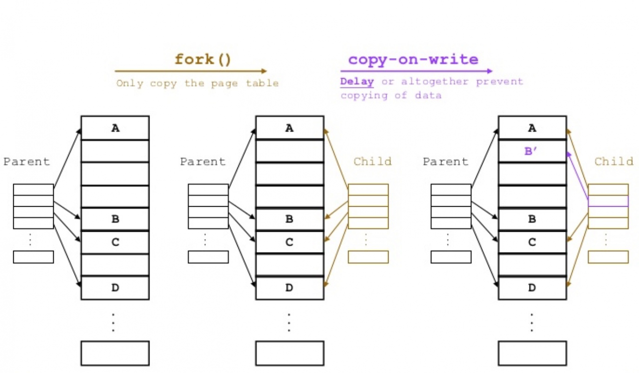 如上图所示,fork 时只拷贝 page table,也就是页表。只有等到某一页发生修改时,才真正进行页的复制。