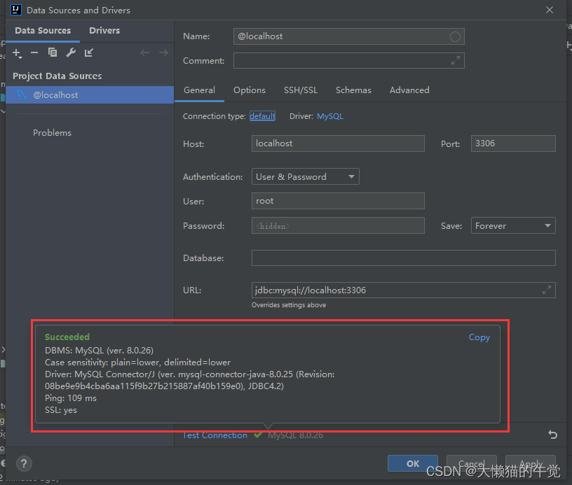 步骤二:输入mysql的账号和密码,点击Test connecttion,如果连接成功会出现下图所示。