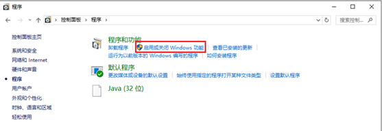 2.打开控制面板,点击【程序】,点击【启用或关闭Windows功能】