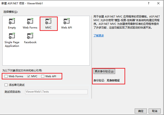 我这里选择的是【MVC】,身份验证选择的是【无身份验证】