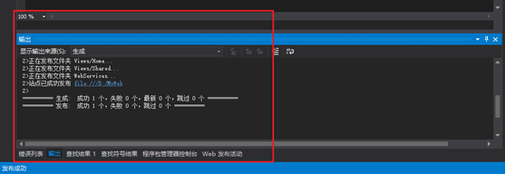 查看VS2012下面的【输出】,没有失败即为发布成功,有些时候会出现发布失败的现象,把发布地址的项目保存一份,之后删除,重新发布即可。