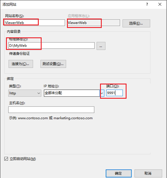 网站名称随便起,物理路径为项目发布的路径。这里的端口需要注意,不要起已经被占用的端口