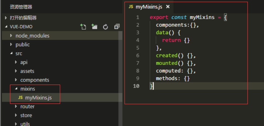 在src目录下创建一个mixins文件夹,文件夹下新建一个myMixins.js文件。前面我们说了mixins是一个js对象,所以应该以对象的形式来定义myMixins,在对象中我们可以和vue组件一样来定义我们的data、components、methods 、created、computed等属性,并通过export导出该对象