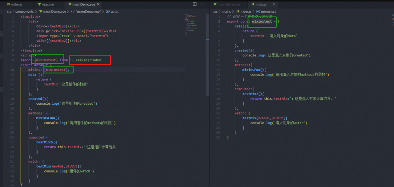 放大看这张图:右边就是一个混入对象; 左边引用了混入对象