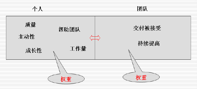刚才说的是团队考核指标,我们的个人的考核指标包含五个指标:质量、工作量、主动性、帮助团队以及成长性。