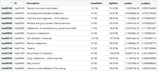 - 可将富集结果输出为数据框便于浏览,如 GO_BP.df,且df按 pvalue 进行排序: