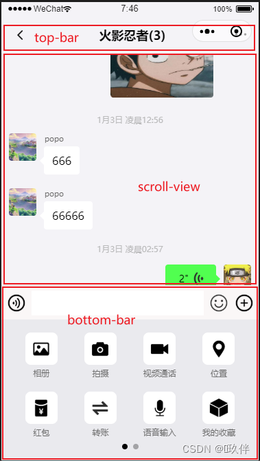 在uni-app使用中,有如下场景,页面有三个组件,top-bar顶部标题栏高度指定,bottom-bar底部功能菜单栏高度指定,scroll-view区域是一个scroll-view滚动区域,浏览聊天内容。要求scroll-view在这两个组件之间正常显示。