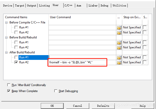 keil生成bin文件方法在options for target -> user中添加:fromelf --bin -o "$L@L.bin" "#L" 博观而约取,厚积而薄发!版权声明:本文为Taqingjie原创文章,遵循CC 4.0 BY-SA版权协议,转载请附上原文出处链接和本声明。原文链接:https://blog.csdn.net/Taqingjie/article/details/119717100