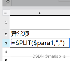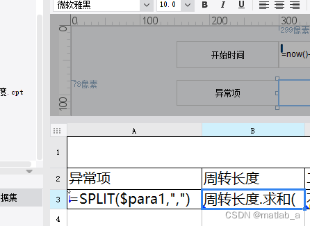 ④本例条件放在了A3,在A3输入SPLIT($para1,",")对数据集内容进行分割:para1为控件名称,A3扩展方式为向下扩展