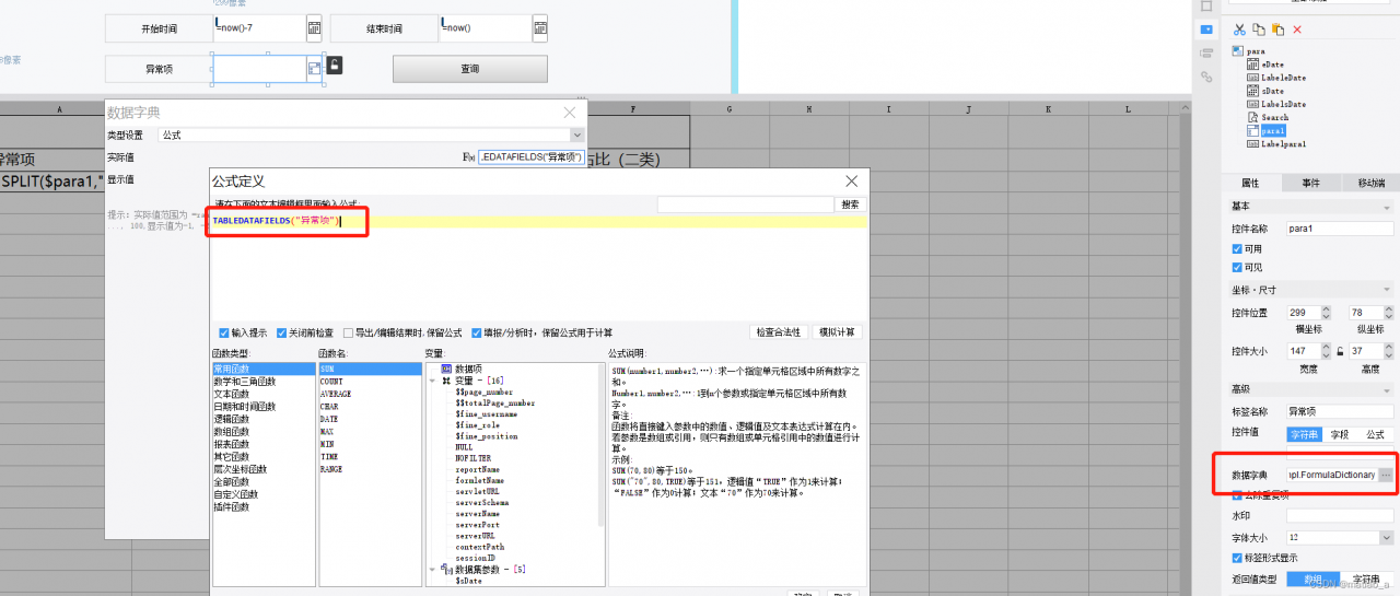 ③在控件数据字典处输入:TABLEDATAFIELDS("异常项")