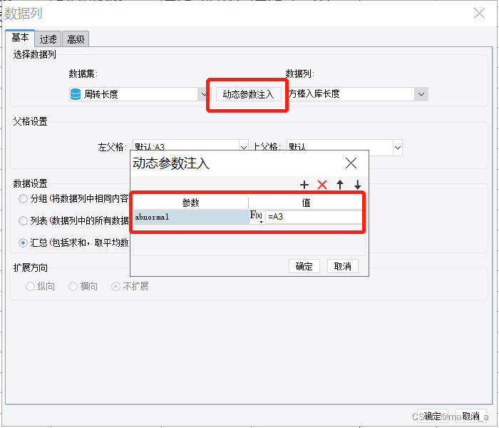 在单元格中双击编辑,点击动态参数注入,输入参数名称(随便起但要与⑤的名称一致)及值(要用到的条件)